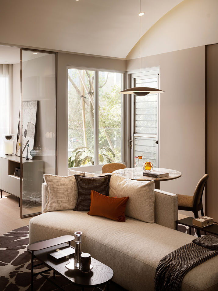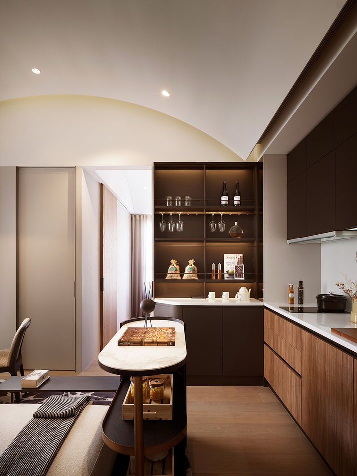 從女性特質中汲取靈感,透過柔美、細膩與流動的語彙,轉化為更具情感層次的飯店寓邸氛圍。空間運用 國際五星飯店常用的義大利 Tabu 木皮、馬來漆與皮革,營造溫潤而帶光澤的質地對話。弧型天花與優雅的線條讓動線更輕盈,色彩則以雅緻中性色為主,形塑出兼具現代、精品與沉穩力量的生活場景,而非僅針對特定性別,而是一種更開放、更包容的美感語言。